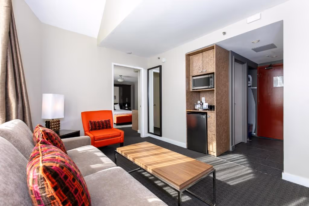 Os quartos dispõem frigobar, microondas, cafeteira e chaleira, cofre, TV, comodidades para passar roupa, banheiro privativo com roupão, produtos de higiene pessoal e secador de cabelo.