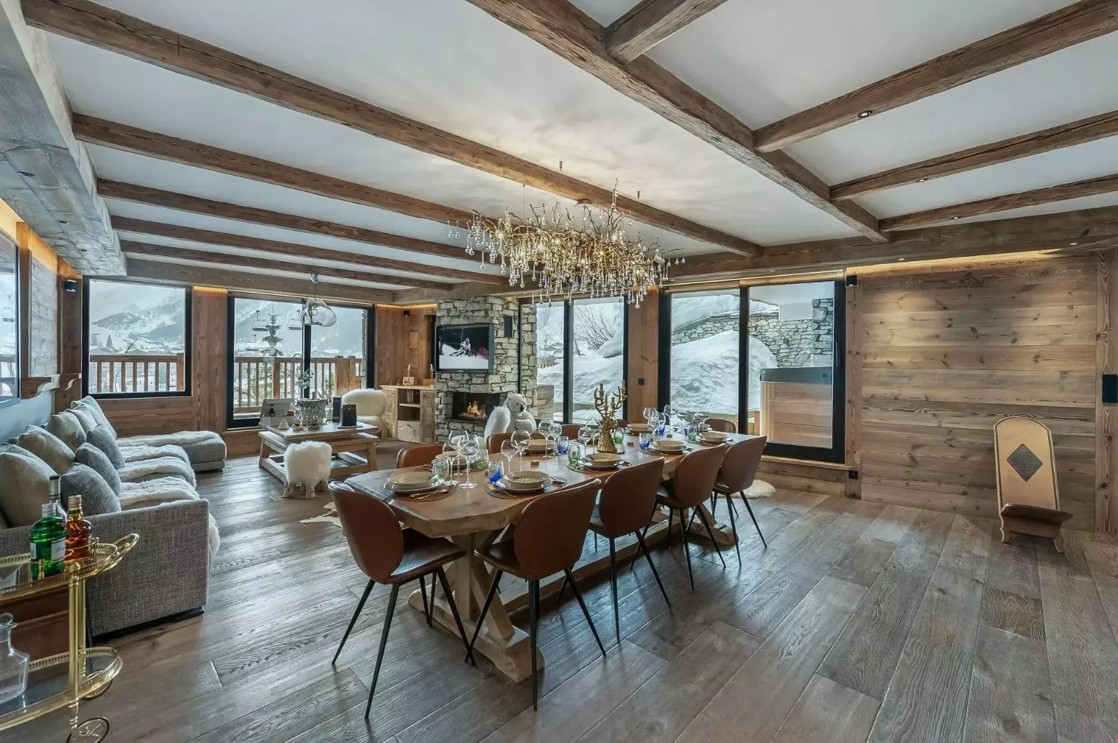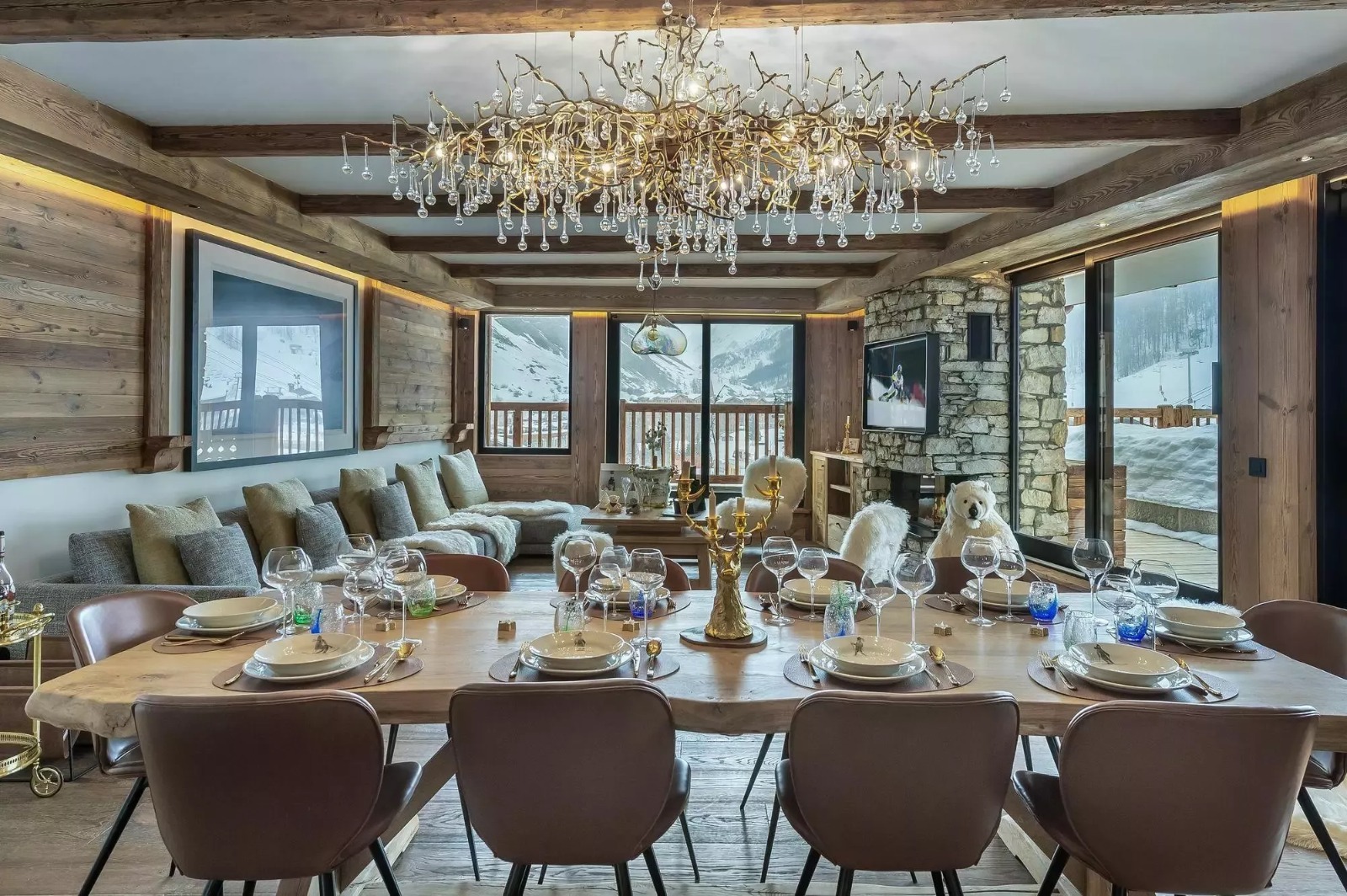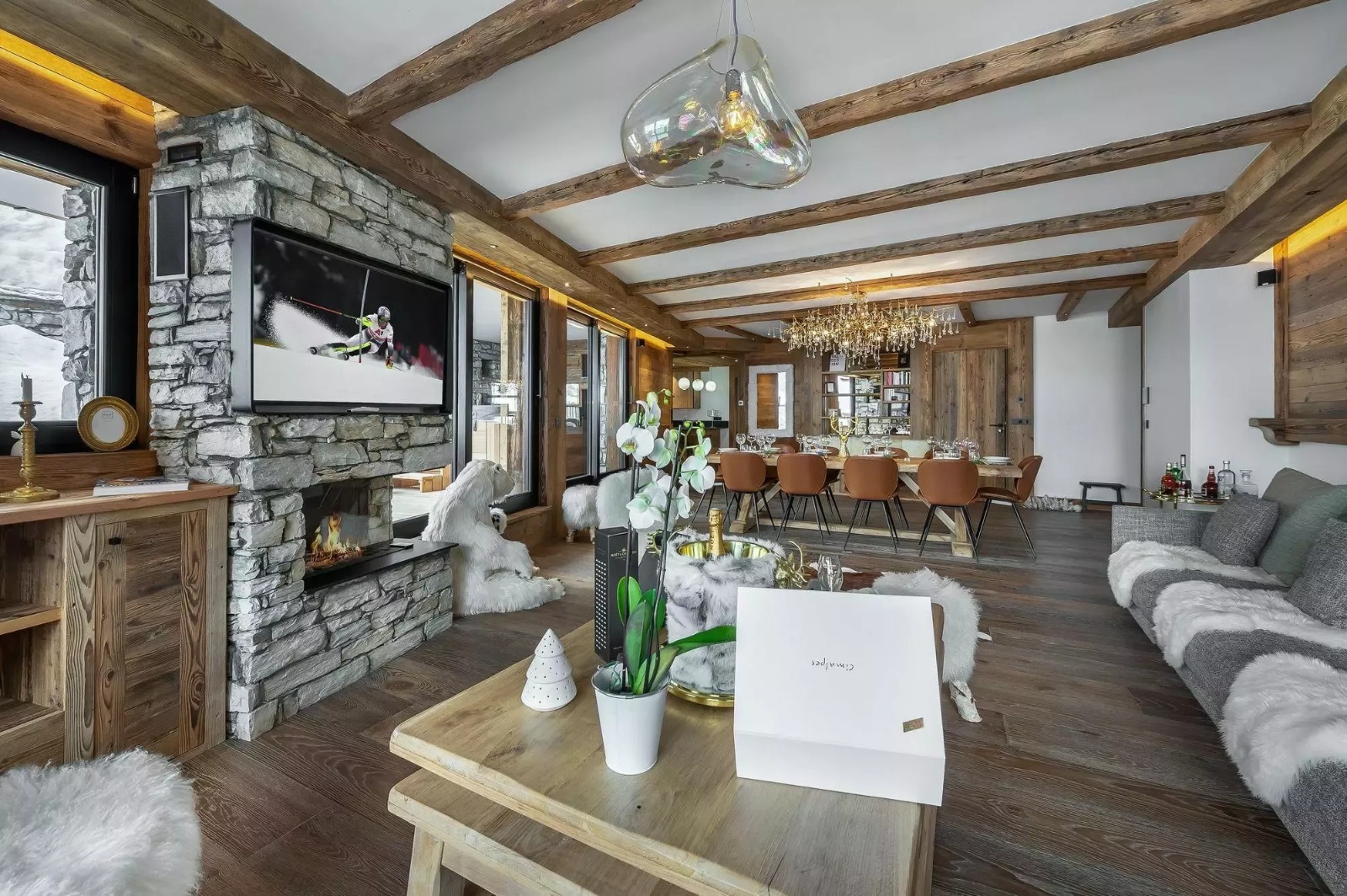 Com 170 m² em um único nível, o espaço impressiona pela amplitude e luminosidade. O design combina materiais típicos da montanha, como madeira e pedra, com elementos contemporâneos em couro, vidro e linhas limpas, criando uma atmosfera aconchegante e sofisticada.