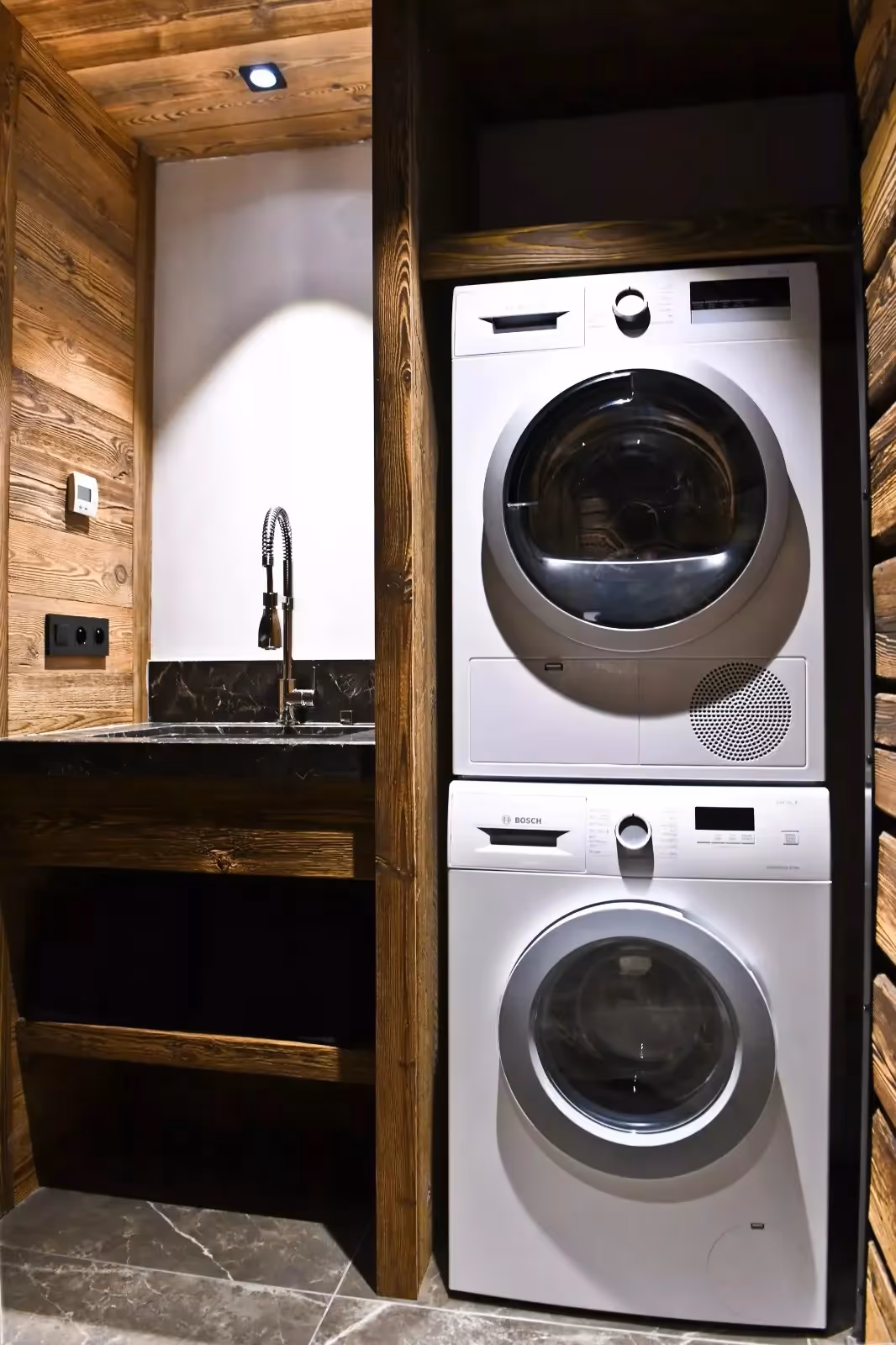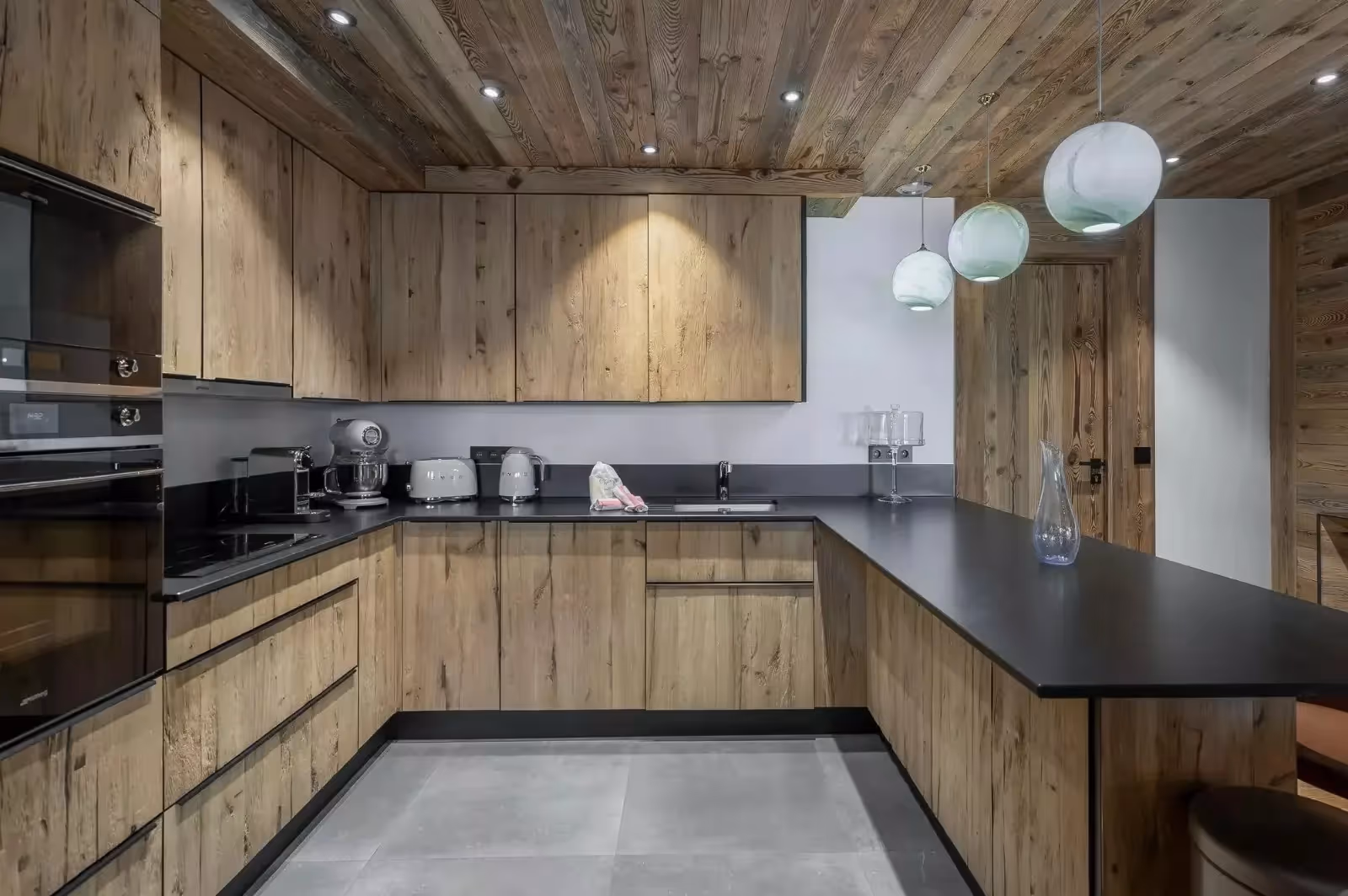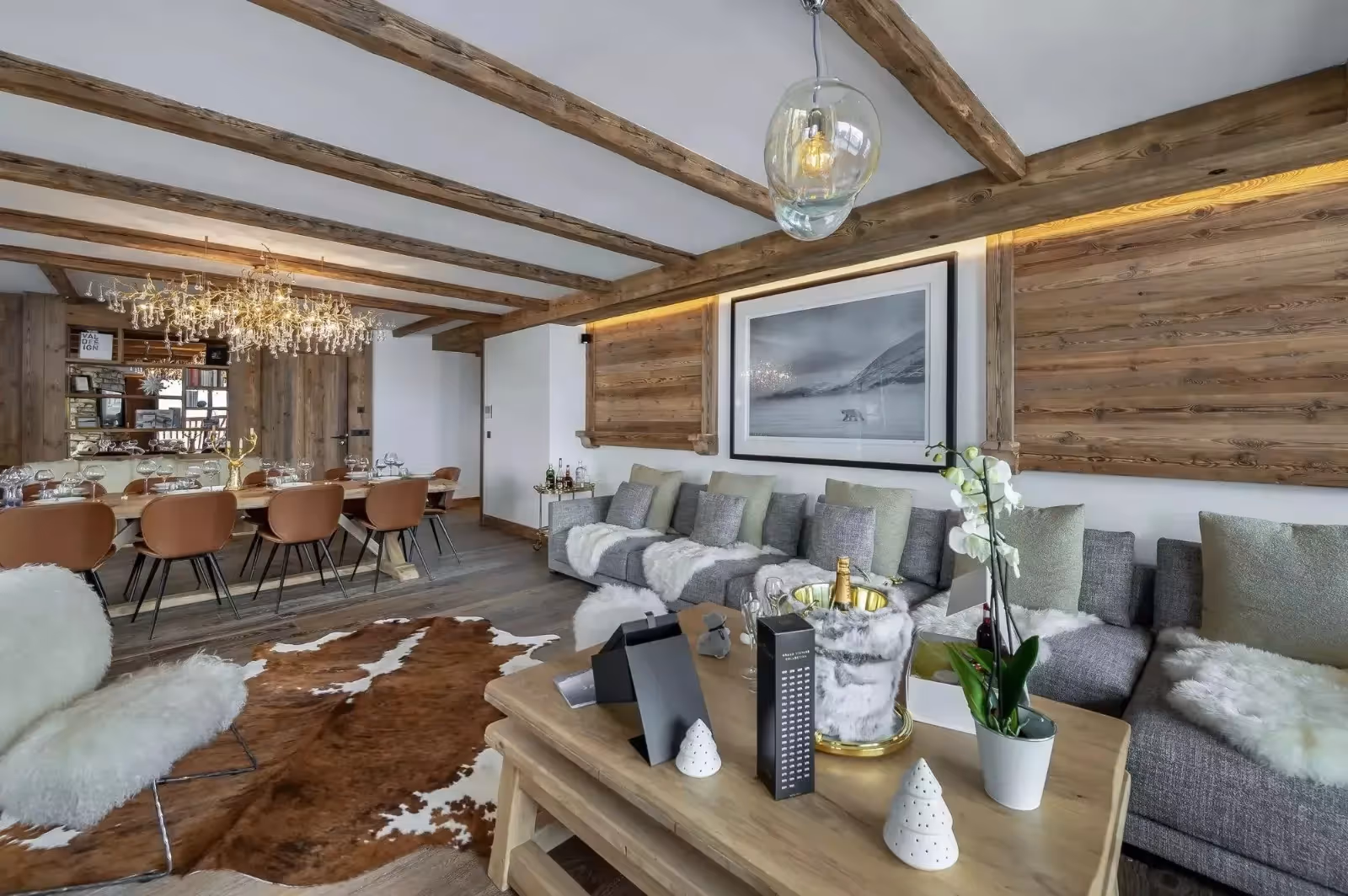 Com 170 m² em um único nível, o espaço impressiona pela amplitude e luminosidade. O design combina materiais típicos da montanha, como madeira e pedra, com elementos contemporâneos em couro, vidro e linhas limpas, criando uma atmosfera aconchegante e sofisticada.