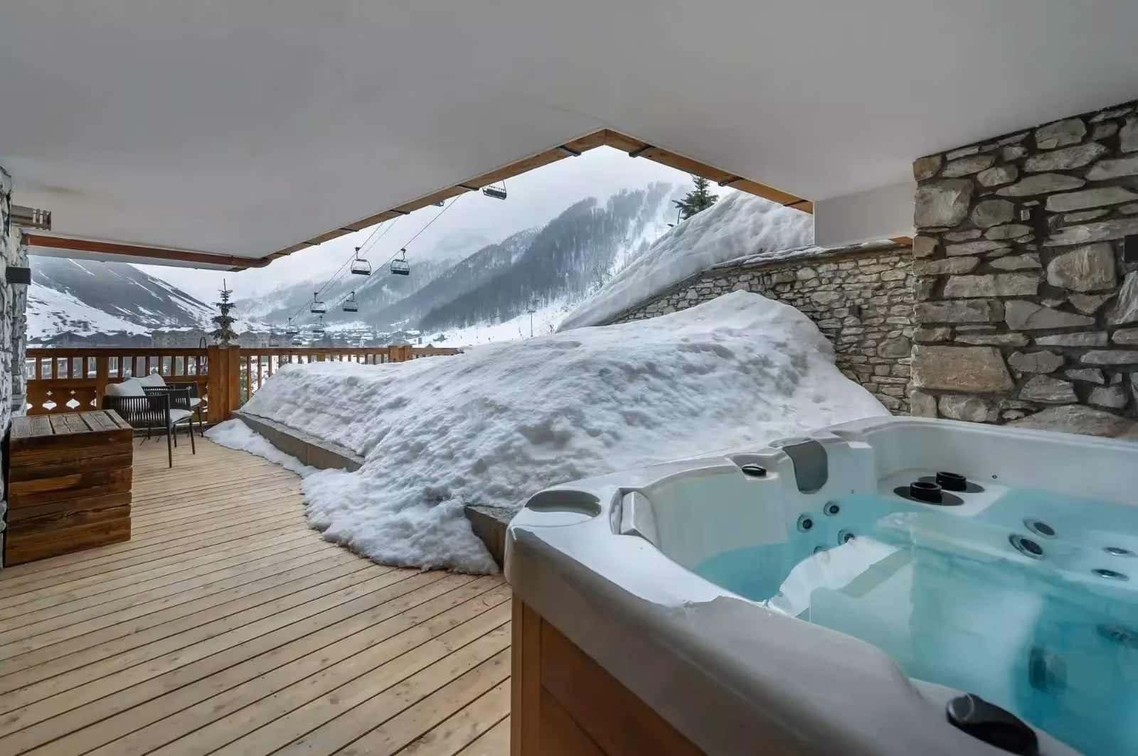 Depois de um dia nas pistas, o jacuzzi externo é o lugar ideal para relaxar e apreciar a vista das montanhas. La Face 1 é uma opção de hospedagem que une conforto, elegância e uma localização excepcional nos Alpes franceses.
