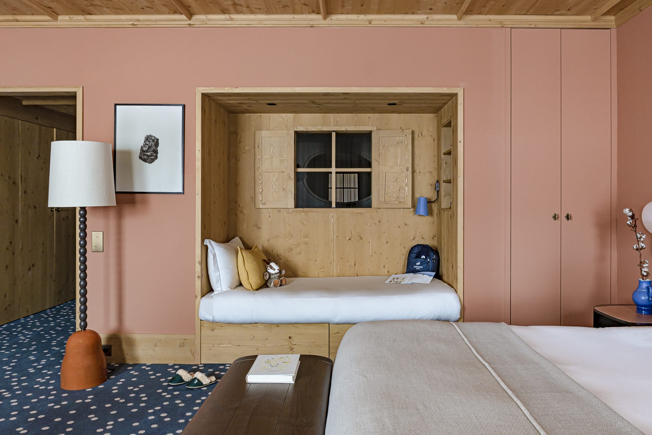 O hotel faz parte da prestigiada coleção Maisons Pariente e se destaca pelo design contemporâneo com atmosfera alpina calorosa, assinada por Pierre Yovanovitch. São 55 suítes e quartos espaçosos, além de dois chalés privativos, todos com vistas espetaculares para as montanhas nevadas.