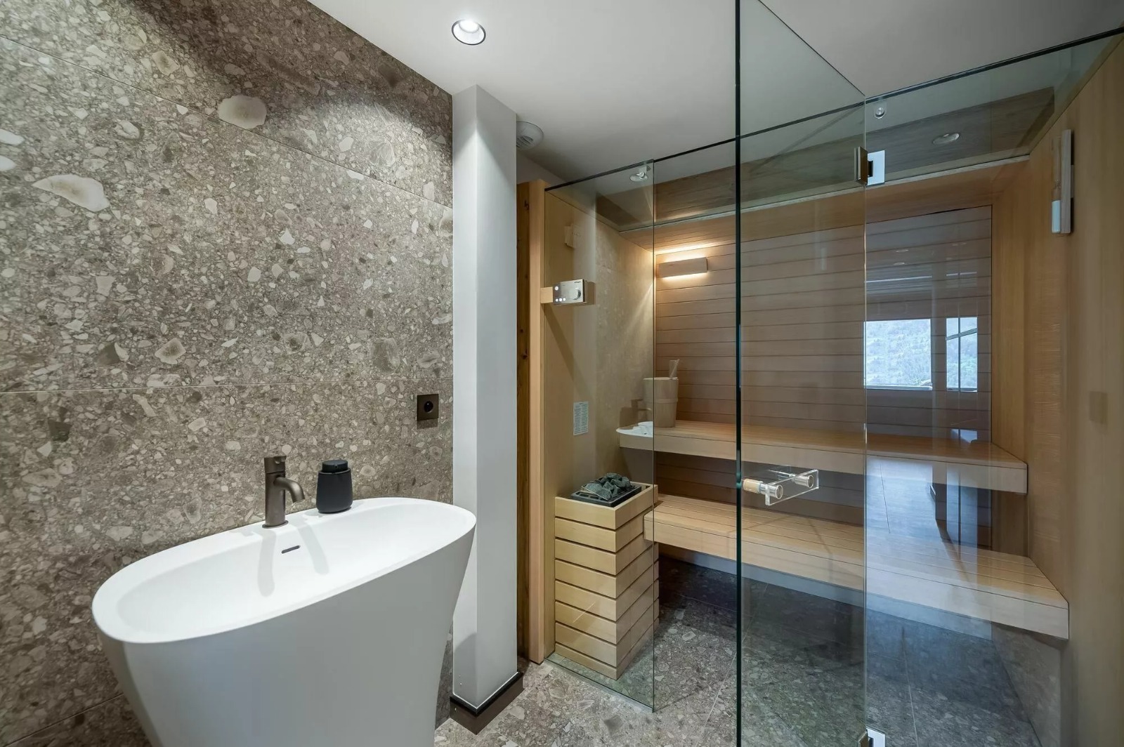 Para relaxar após o esqui, o apartamento oferece uma área de bem-estar completa, com banheira de hidromassagem interna com vista para a neve, sauna e mesa de sinuca no mezanino.