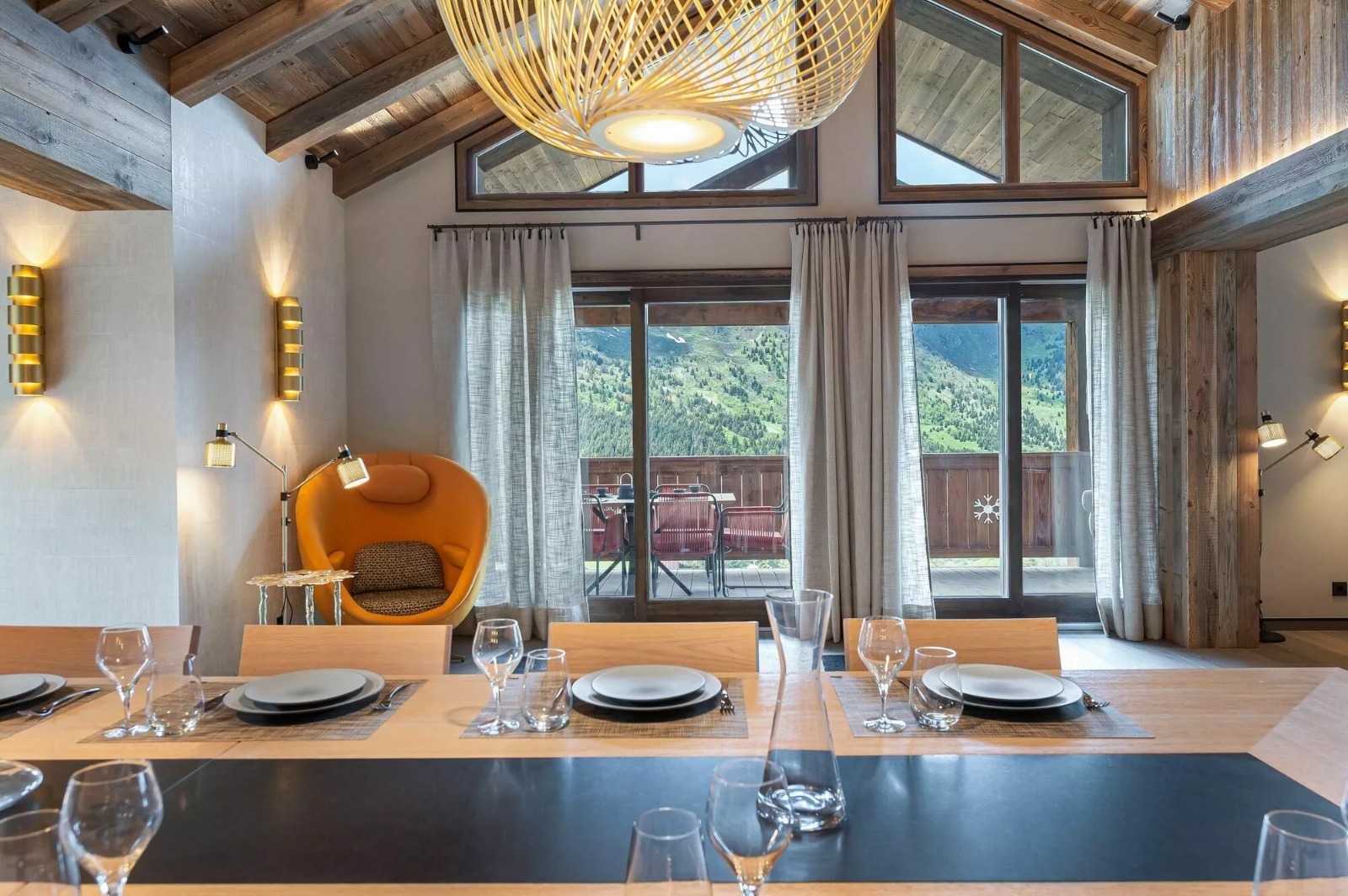 A área social é ampla e elegante, com pé-direito duplo, grandes janelas panorâmicas e uma lareira central que reforça o clima alpino sofisticado. A decoração em madeira e o design contemporâneo criam um ambiente acolhedor, complementado por uma ampla varanda com vista deslumbrante para as montanhas de Méribel.